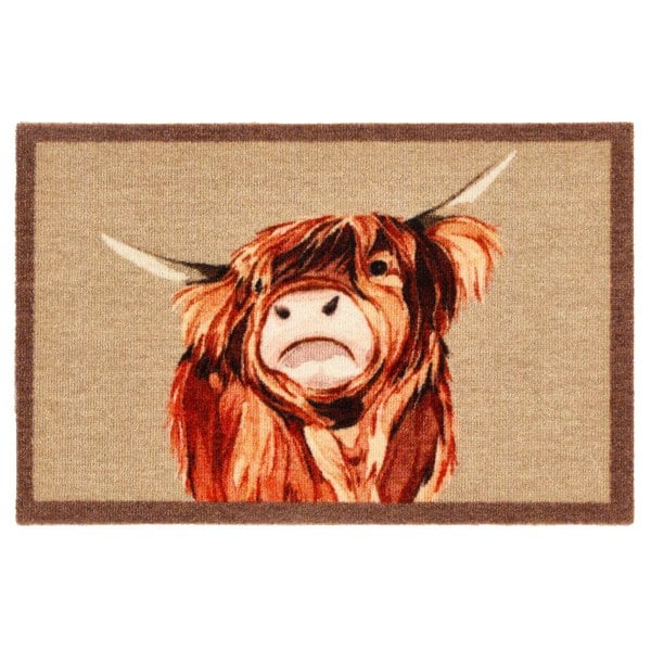 My Mat Highland Cow features a single centred Highland Cow in oranges, browns and reds with a beige background and a brown border
