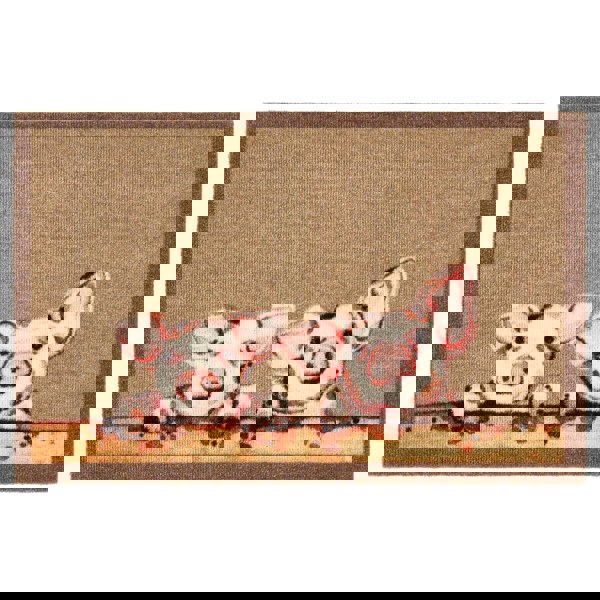 My Mat Piglets features two muddy pink piglets peering over a ledge with a light brown background and dark brown border