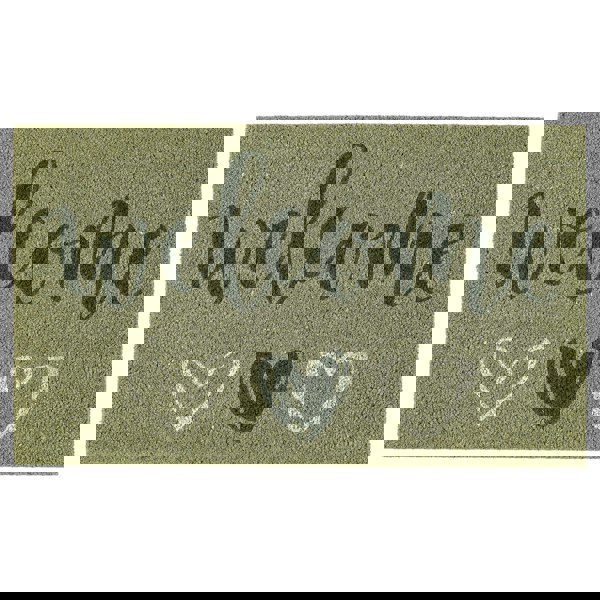 Our coir Welcome Sage Green design features the word Welcome in a dark green script font, on a sage green background