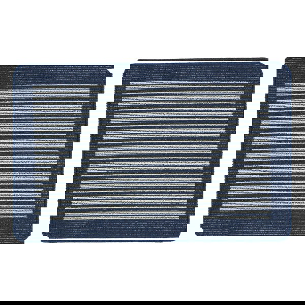 It features white stripes on a navy background with a thick navy border around the edge of the mat