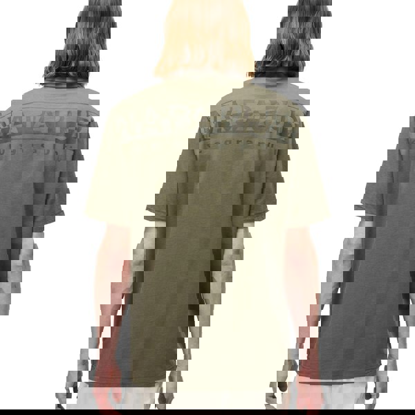 The Napapijri Fanes Pocket T-Shirt in Tea Leaf boasts a relaxed silhouette, featuring a ribbed crew neckline, short sleeves, and a striking open chest pocket detailed with the Napapijri printed logo.