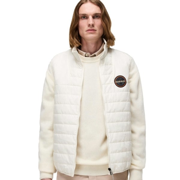 The Napapijri Tosa Vest Gilet in Off White Beige offers a relaxed silhouette with lightweight padding and a front baffle construction, providing effective insulation for transitional weather. It features a high protective collar, a full-length zip closure, and the distinctive Napapijri Bollo patch on the left chest, combining functional design with brand heritage.