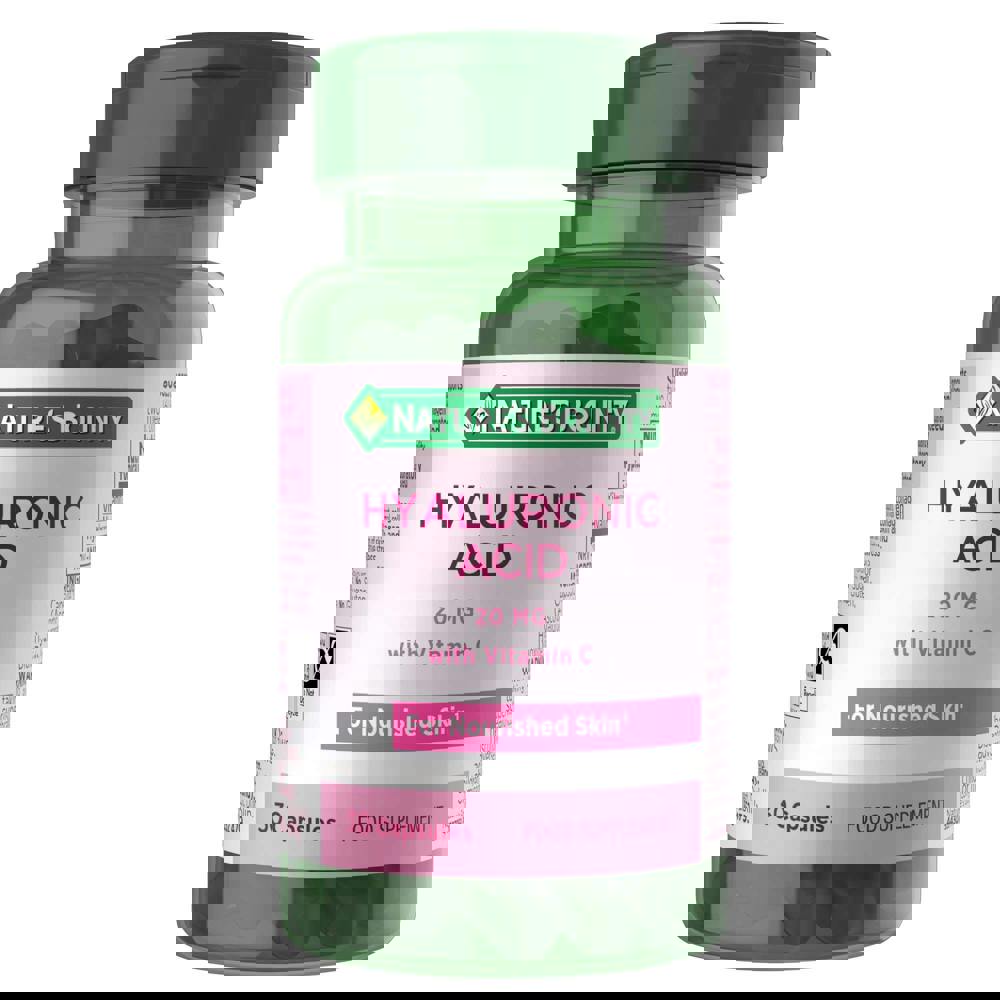 From Nature’s Bounty, Hyaluronic Acid 20mg with Vitamin C is a food supplement designed to support your skin’s structure from within, with added vitamin C. Hyaluronic acid (also known as HA) is a naturally occurring substance found in the body, particularly in the skin and joints, and is known as a water-loving molecule.