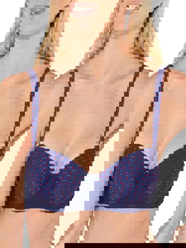 In a classic navy with a red polka dot print, the Navy & Red Spotted Underwired Bikini Top is an underwired bikini top with a clean, structured finish. Adjustable straps allow the fit to be tailored, while a plastic clip back fastening keeps the closure secure and simple. The polka dot design pairs with other mix and match styles for flexible styling across your swimwear collection.