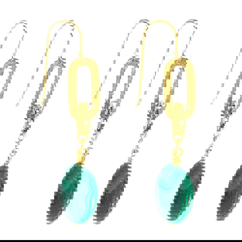 Materials: Recycled brass, gold ear hook wires, natural Malachite gemstones.