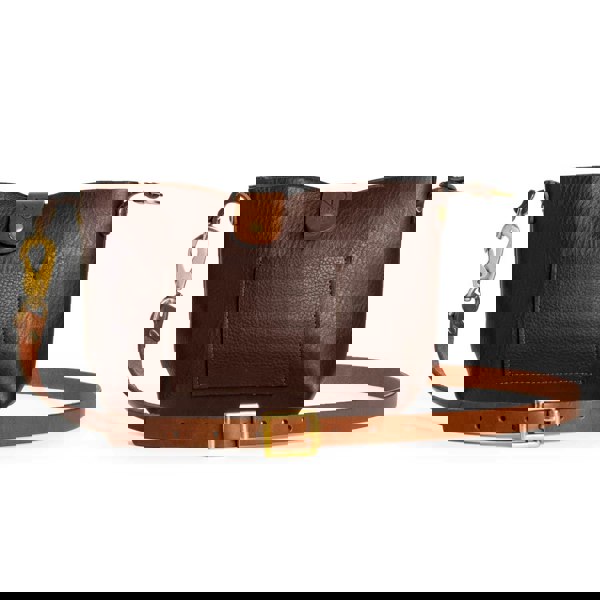 The detailsContrasting chestnut leather straps, top zip closure, front strap twist lock closure, long adjustable strap with brass buckle closure, x 1 open back pocket & our iconic N'Damus London logo embossed to the front strap closure.