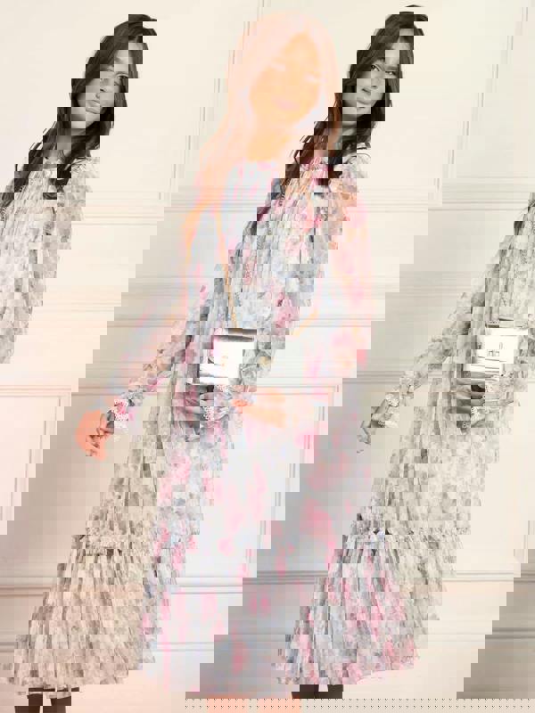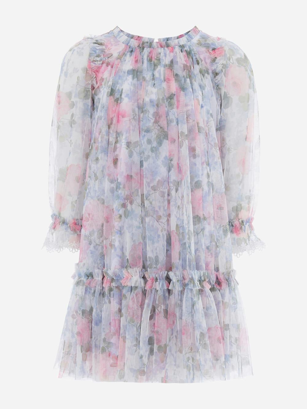 Needle & Thread Girls Camille's Garden long sleeve dress in blue brings a garden-inspired look to a classic silhouette. Floral motifs sit across a serene blue base, creating a detailed finish that suits a range of occasions, including family gatherings and school events.