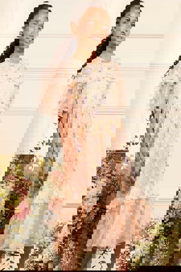 This Needle & Thread girls occasion dress comes in cream and pink with tulle material and chiffon trims. Embroidery and sequins add detail across the bodice, while the tiered hem creates a layered finish. A round neck and draped short sleeves complete the silhouette, with a zip fastening for a neat closure.
