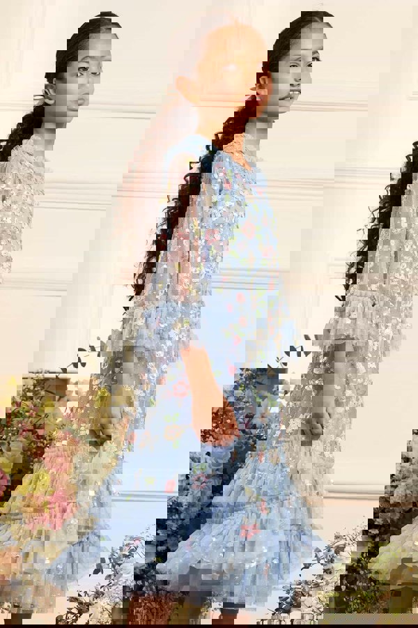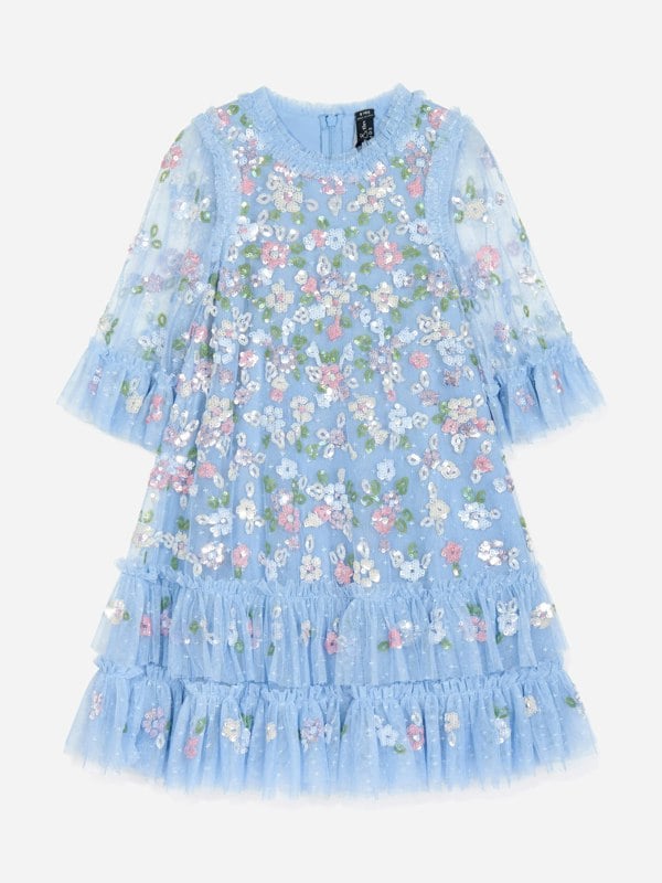 Needle & Thread envision fairy tale aesthetics in their vintage-inspired silhouettes. This girls sky blue ocasion dress is adorned with tiny, glittering sequins all over via a beautiful tulle fabric.