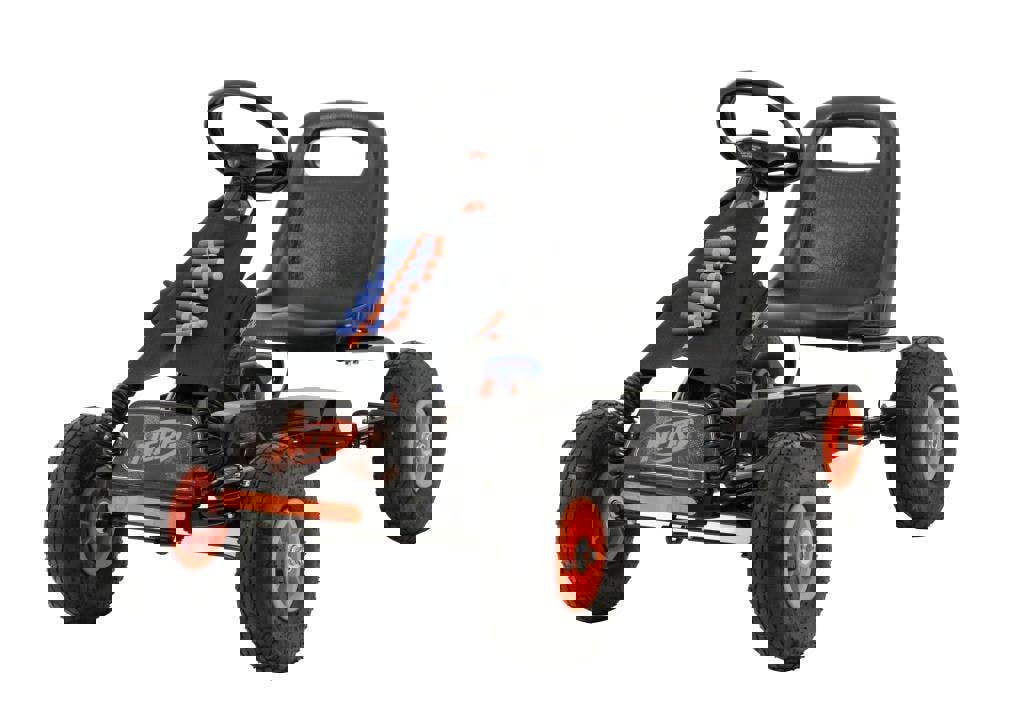 It'S Nerf Or Nothin'! The Nerf Go Kart Is Ideal For Beginners Who Are Ready For The Next Four-Wheel Challenge. Featuring Responsive Steering Wheel, Reactive Handbrake And Chunky, Deep Tread Tyres, Riders Are In For A Fast And Comfortable Journey! Be Ready For Action With The Two Nerf Blasters And Ten Nerf Darts In Stem Wrap Holster! The Fully Printed Wrap Is Removable For Additional Play And Easy-Wipe Down. Ride To A Stop, Retrieve The Blaster And Take Action. The Go Kart Is Assembled Quickly And Easily Making It A Perfect Gift. The Ergonomic Moulded Seat And High Back Rest Ensures Comfort And Optimal Sitting Position, Whilst Chain-Driven Forward And Reverse Pedal Ride Directions Make This The Ultimate Ride. The Fully Printed Front Features Striking Nerf Graphics Meaning Riders Will Look Neat On The Streets!