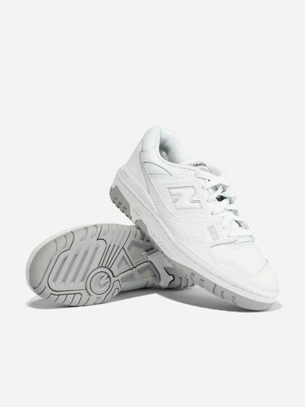 These New Balance Kids 550 trainers come in white with a clean, classic look. The leather upper uses textured sidewalls, finished with embossed New Balance branding for a defined, branded profile.