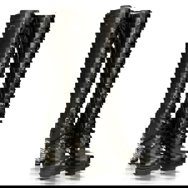* Striking Gothic Design: A bold blend of gothic flair and urban style, these high boots stand out with their commanding silhouette, metallic heel accents, and intricate lace-up detailing
