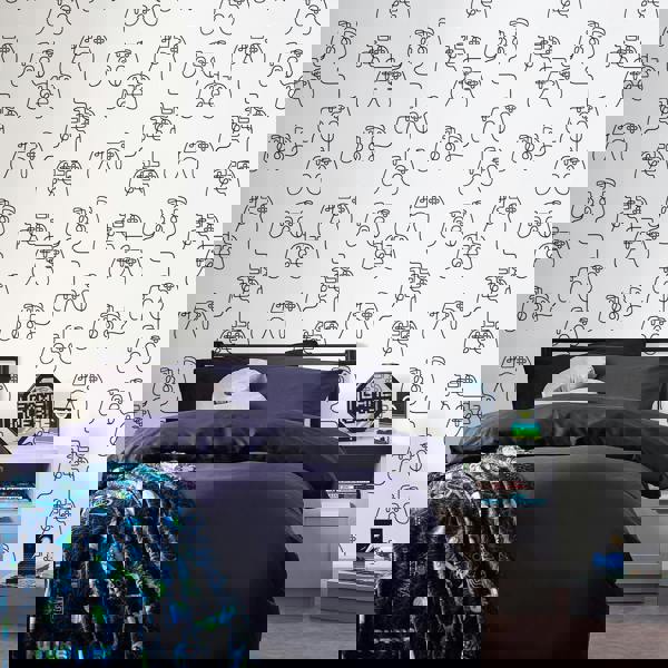 Gamer Doodle Black & White is a gorgeous contemporary collaboration of styles. Featuring a single line inspired game controller design in black laid upon a pure white backdrop, for that fun child friendly design, but in an adult friendly aesthetic. Making this matt finish wallpaper an all round crowd pleaser.