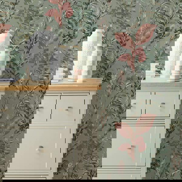 Turn your interior into a tropical haven with the Fantasy Rainforest Leaves wallpaper. This colourful, bold design is perfect to create an on trend focal point in the home. Featuring a stunning colour combination of sage greens and pops of terracotta, each is perfectly showcased upon a muted sage background. Printed on matt paper this design has a contemporary finish whilst also being paste the wall making this wallpaper easy to hang.