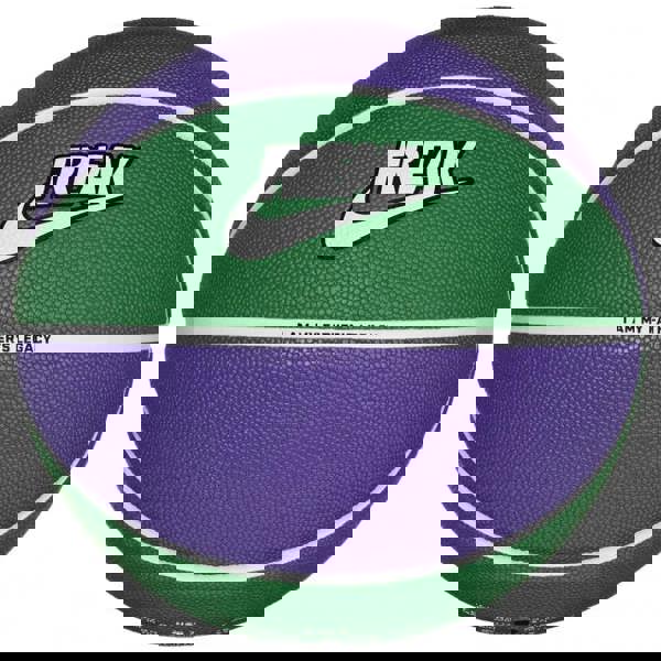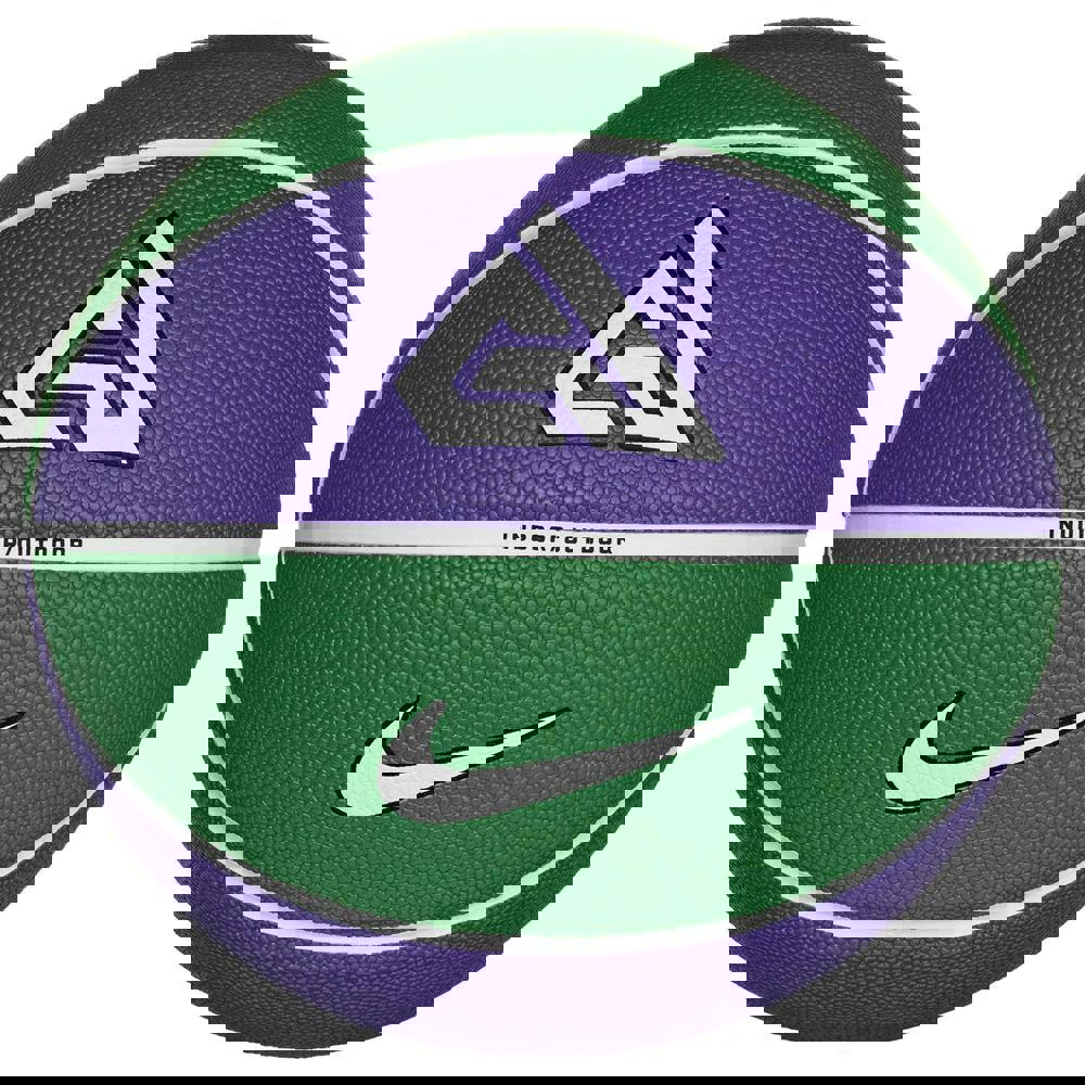 The Nike All Court G. Antetokounmpo Basketball in purple and green is designed for indoor and outdoor play. Featuring an 8-panel construction with deep channels, it offers a defined grip profile for handling during games and practice.