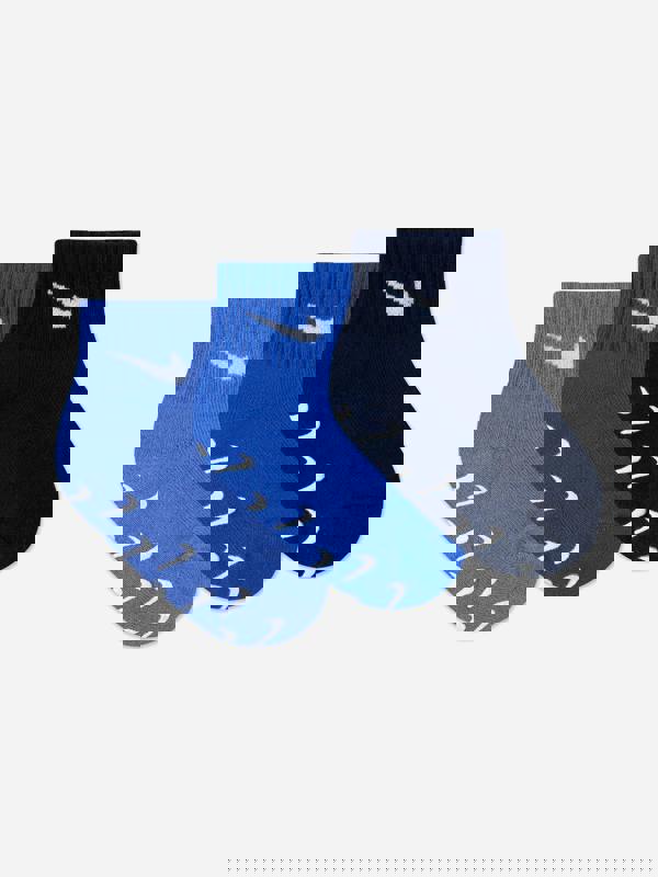 This Nike baby boys sock set includes three pairs of gripper quarter socks in blue. The gripper patterns add extra traction for steadier movement, making them a practical choice for everyday wear. A soft, breathable material keeps them comfortable throughout the day.
