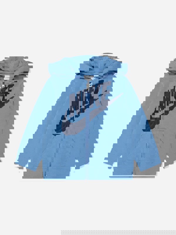 Nike Baby Boys JDI Toss 3 Piece Set in midnight navy includes a hoodie, a bodysuit and matching joggers. The hoodie has long sleeves, ribbed details and a zip fastening, finished with a kangaroo pocket. The bodysuit has an all-over logo print with folded shoulders, short sleeves and press stud fastenings. Joggers complete the set with an elasticated waist and ribbed cuffs.