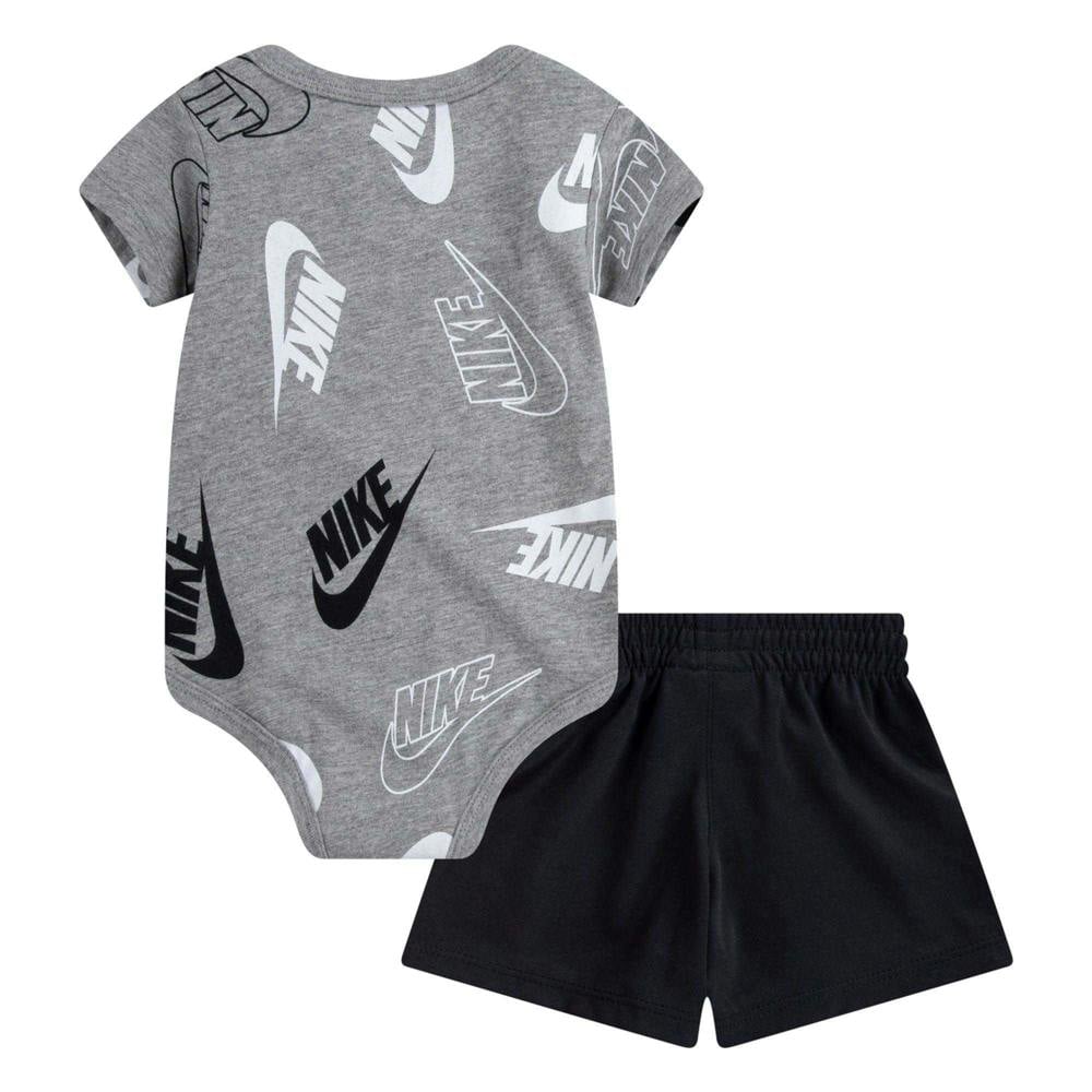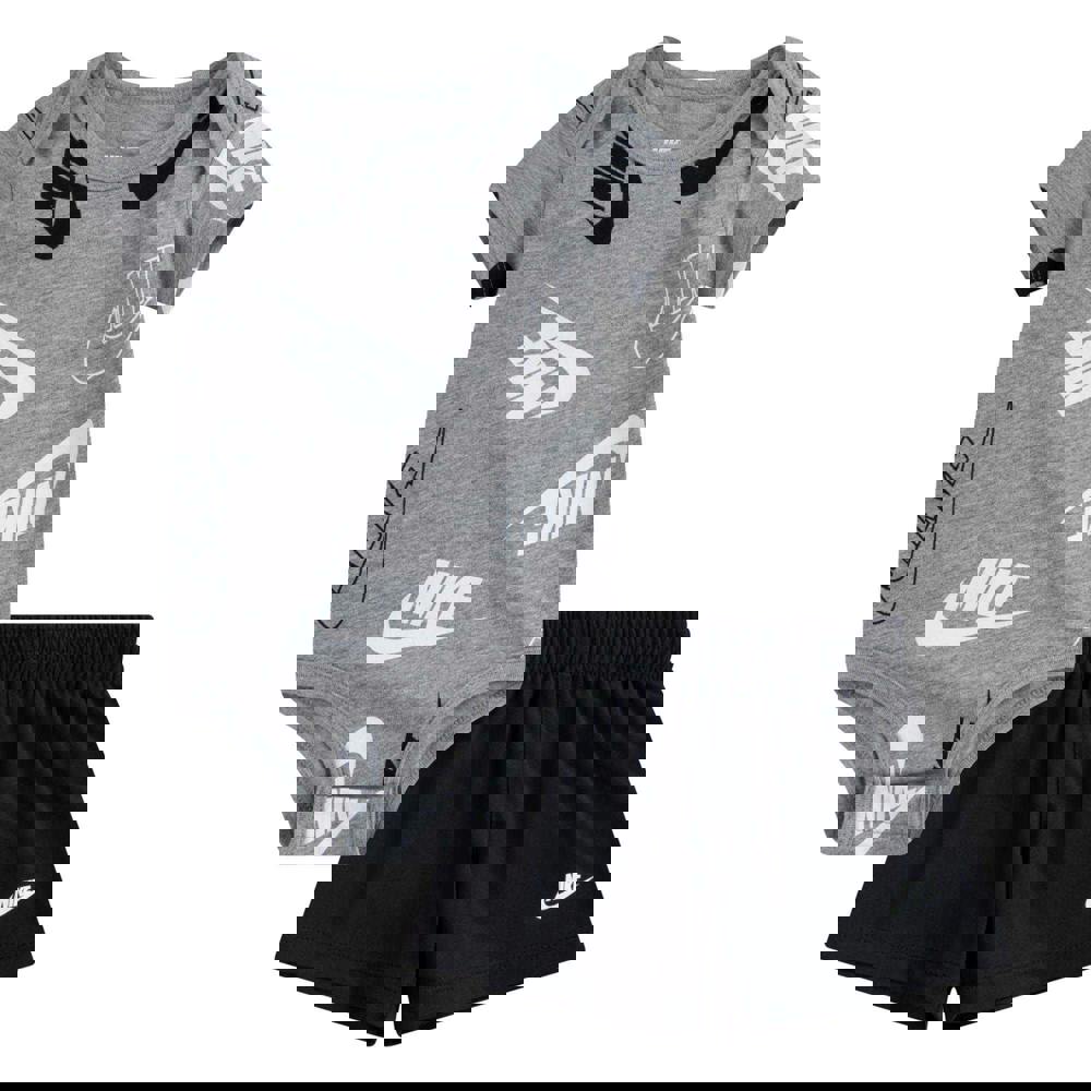 This Nike baby set includes a top and matching shorts in black and grey. Made from a cotton and polyester blend in tricot fabric, it has a logo design and a soft fabric technology finish. The top is short-sleeved with a crew neck and a pull-on fastening for simple dressing.