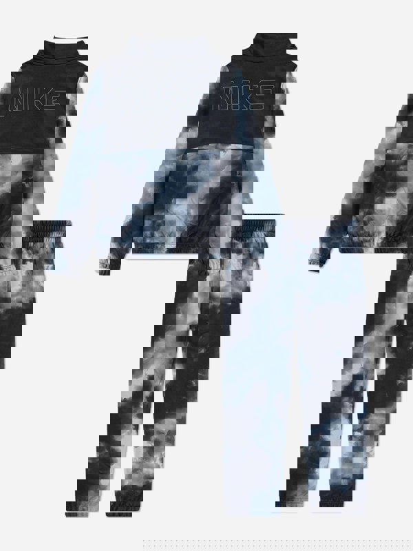 This Nike boys tracksuit in smoke grey includes a cardigan and matching pair of trousers. A sky print in black and grey shades runs through the set, finished with an embroidered blue logo on the chest and left thigh.