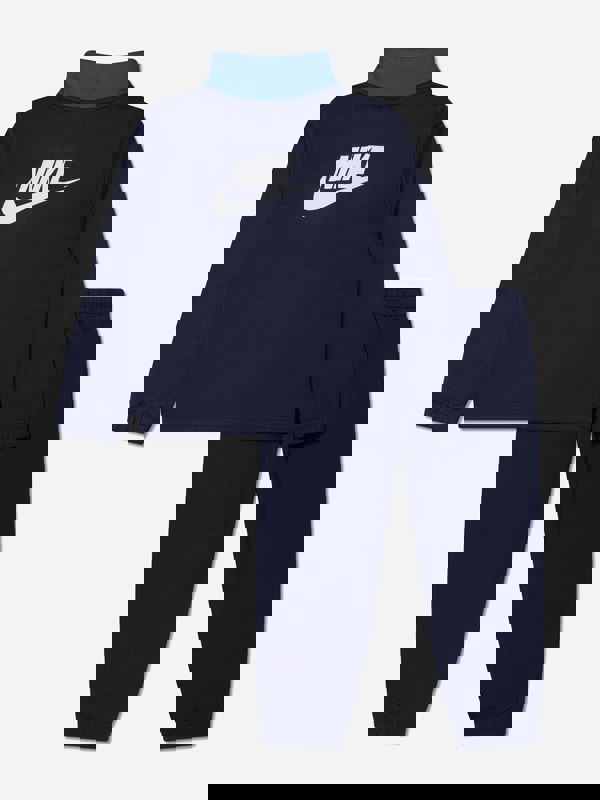 This Nike boys tracksuit comes as a coordinated two-piece set in midnight navy. A two-tone colour design and Nike logo enhancements add a clean, sporty finish, while detailed stitching completes the look.