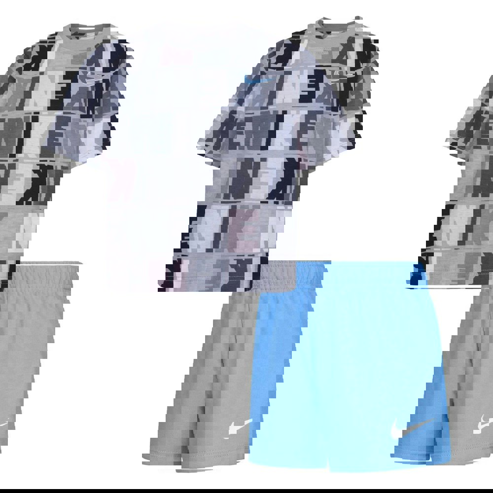 The shorts sit on an elasticated waistline for an easy fit. Both pieces are finished in a blue, grey and white colour palette.