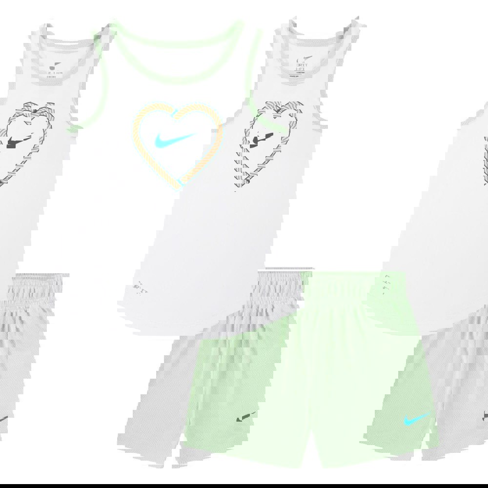 This Nike girls’ Happy Camper set includes a mesh tank top and matching bottoms in green and white. Made from polyester with a knitted mesh fabric, it has a contrast design with heart and logo details. The top has a round neck, sleeveless cut and racerback shape.
