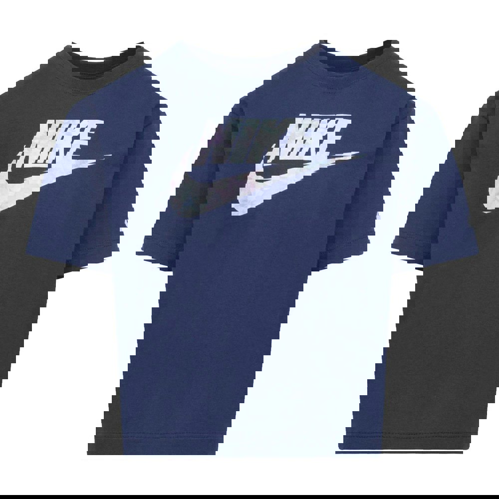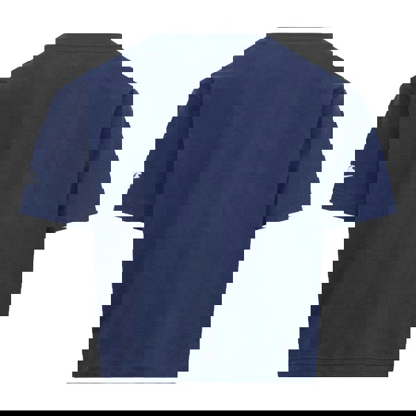 It has a crew neckline, short sleeves and a drop-shoulder cut. The navy design is finished with a printed logo and sci-dye effect.
