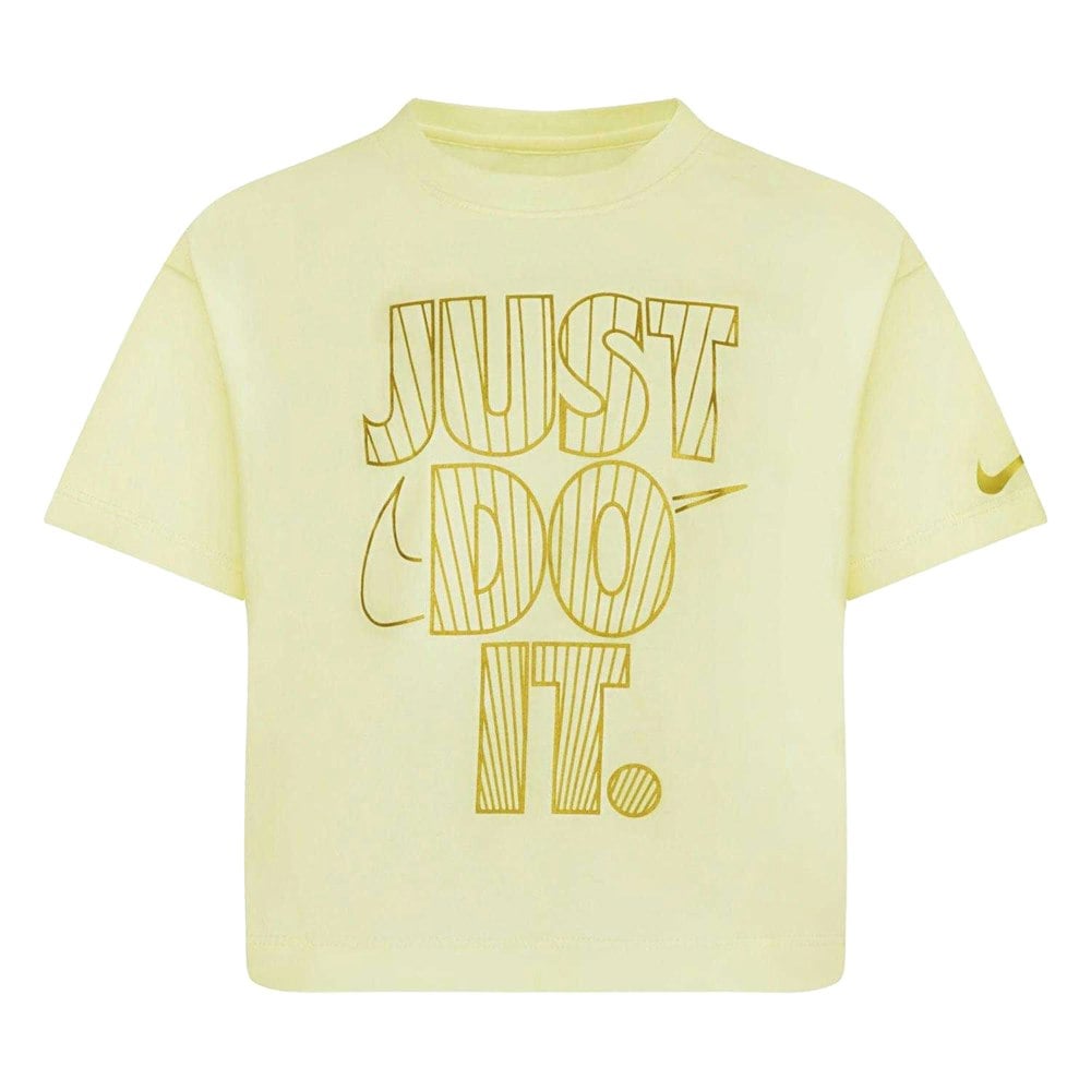 This Nike girls’ boxy T-shirt comes in cream jersey knit with a soft-touch finish. It is made from a cotton and polyester blend and has a crew neck with short sleeves. The drop-shoulder cut and tagless construction keep the look clean and simple.