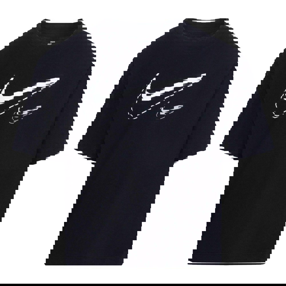 This Nike girls’ Swoosh boxy T-shirt comes in black with a printed Swoosh design. Made from a cotton blend jersey with a textured finish, it has a crew neckline, short sleeves and a straight hem for a clean, simple shape.
