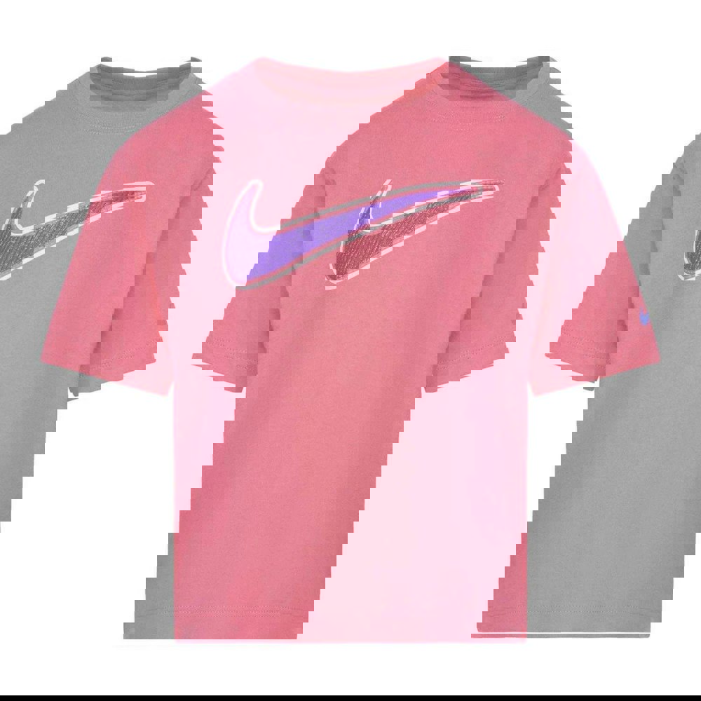 This Nike girls Swoosh Varsity T-shirt comes in a cotton blend with a soft-touch jersey knit finish. It has a crew neck and short sleeves, with a relaxed fit for an easy shape. A contrast logo outline adds a clean, graphic look, while the drop-shoulder cut and tagless construction keep the design simple and streamlined.