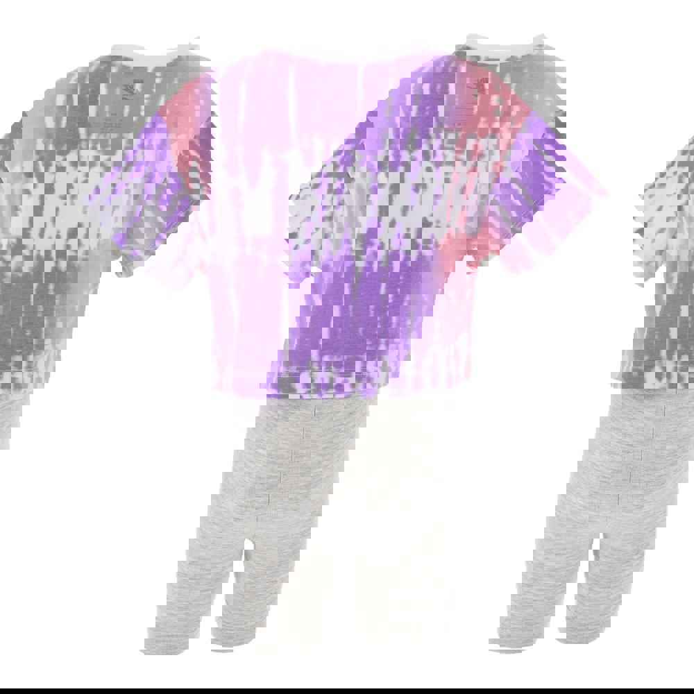 This Nike kids set includes a boxy top and matching shorts in grey. The top has a ribbed crew neckline and short sleeves, with a logo and tie dye design. The shorts have an elasticated waist and a pull-on fastening.