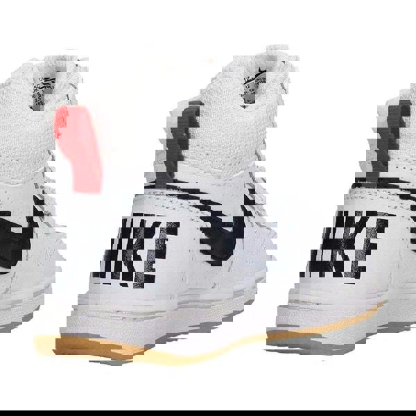 Nike Kids Court Borough trainers in white, black and red with a mid cut and flat profile. The upper combines durable leather with perforated textile, finished with contrast detailing, panel detail and logo branding. A lace-up fastening runs through seven eyelets, while a cushioned, padded collar and pull tab complete the design. Underfoot, a rubber cupsole outsole provides the base, with a round toe shape to finish.
