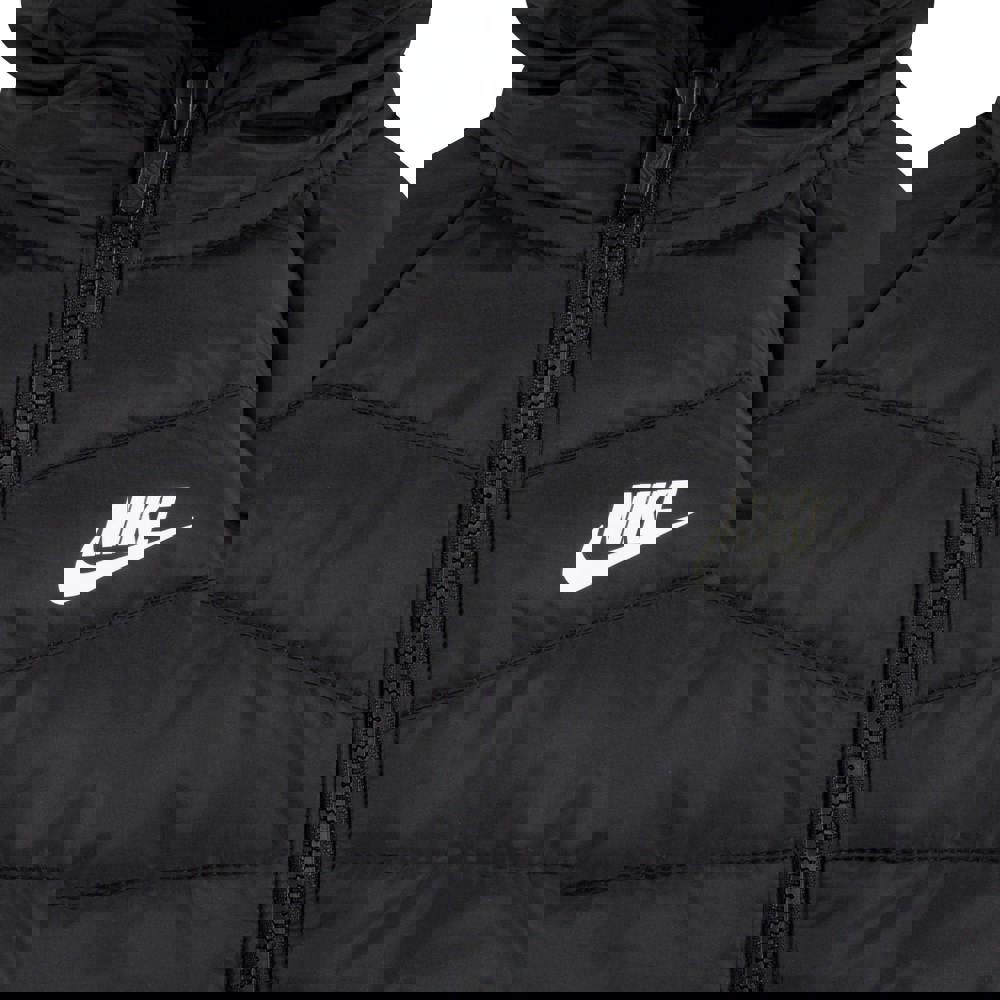 This kids’ padded jacket from Nike comes in black with a logo design. It has a lightweight, water resistant fabric technology and a hooded neckline for added coverage. Long sleeves, elasticated cuffs and an elasticated hem create a secure finish, while a full zip fastening allows easy on and off.