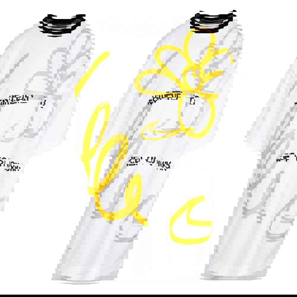 This Nike kids T-shirt comes in white with a printed design and a classic crew neckline. It has short sleeves for a clean, simple finish.