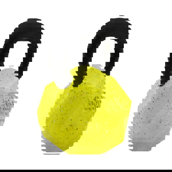 The Nike Max Fusion Kettle Bell Dog Toy is a yellow dog toy with a ball and weight-inspired design. Made from natural rubber and recycled materials, it is durable and flexible for everyday play. The toy can be filled with treats and is designed for slow release, helping to keep dogs engaged during playtime.