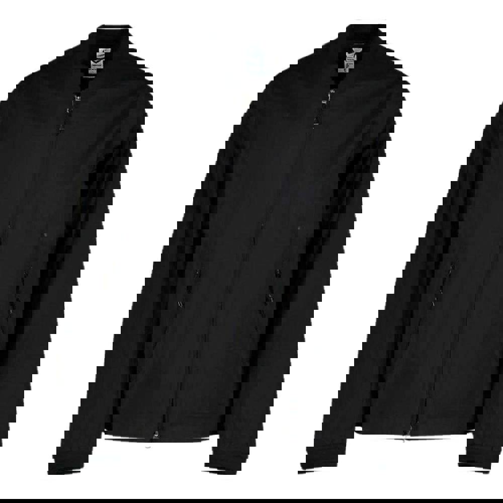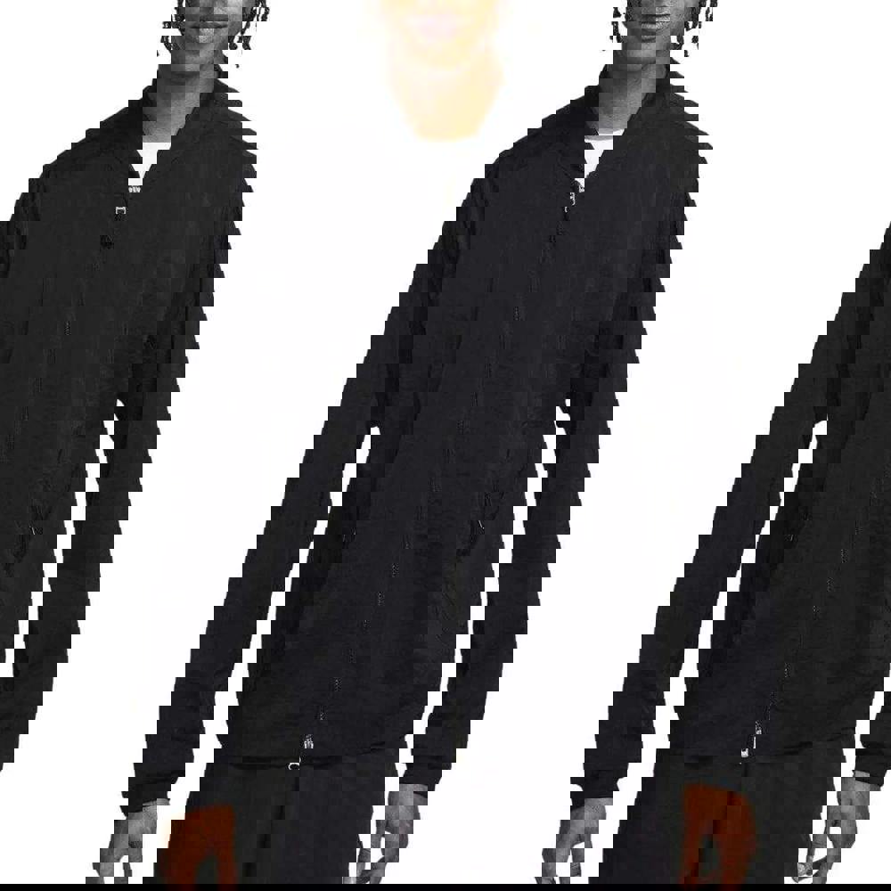 This bomber jacket is made from 92% nylon and 8% elastane in a stretch woven fabric. It comes in black with a plain finish and a tonal logo, finished with a standing collar and long sleeves. A full zip fastening completes the front.