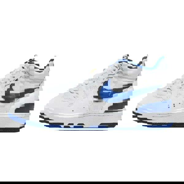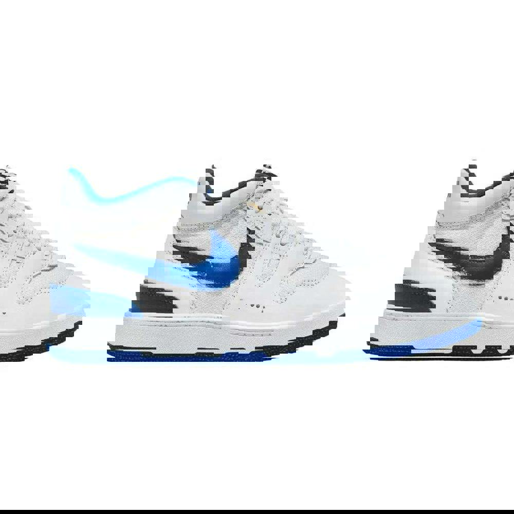 Nike Attack leather trainers in white and blue with a low-cut profile and round toe. The upper combines leather and textile, finished with contrast detailing and logo branding. A lace-up fastening runs through eight eyelets, paired with a flat sole for a clean, classic look. The rubber outsole completes the construction, suited to everyday wear.