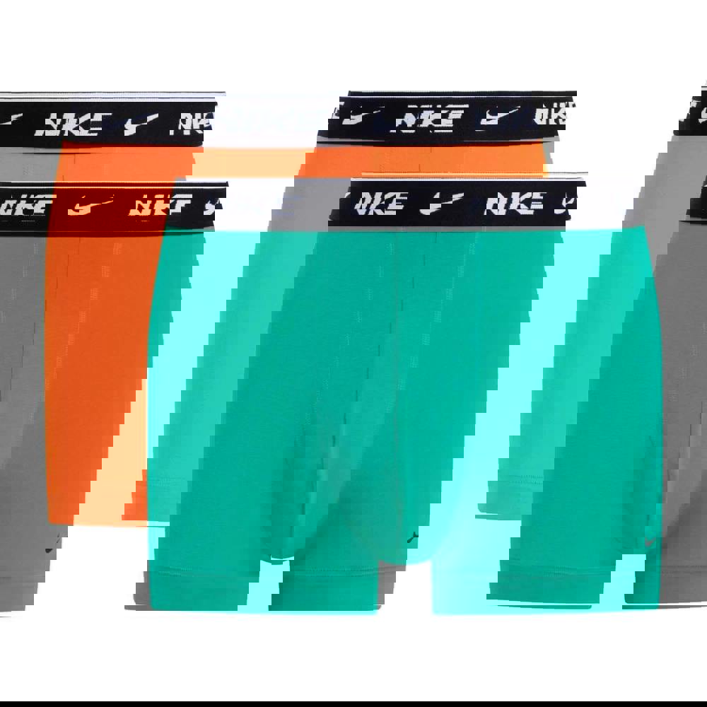 Nike men’s boxer shorts in a pack of two, finished in green and orange. Made from 95% cotton and 5% elastane, the stretch fabric offers a soft handle for everyday wear. Each pair is detailed with a plain design and a Swoosh motif, with an elasticated contrast waistband for a secure feel.
