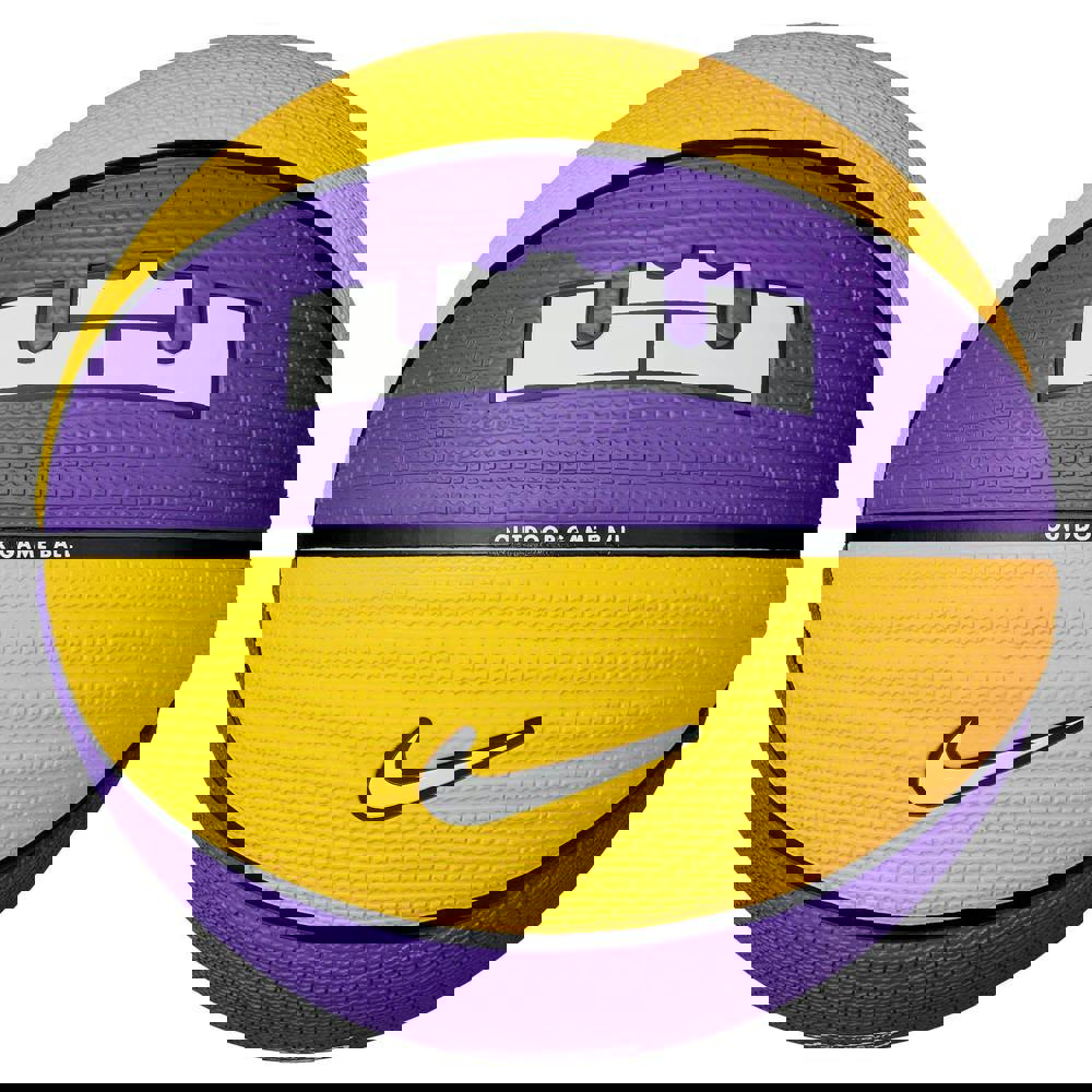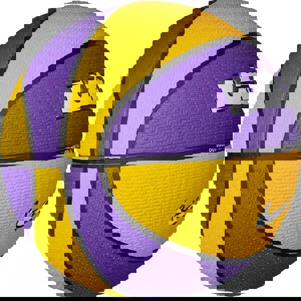 Finished in yellow and purple, this Basketball features a contrast design with logo detailing and a textured surface. Deep channels help define the panels for a clear, structured feel in hand during play.