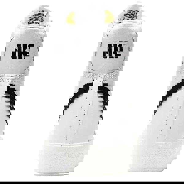 Nike Blazer 77 trainers in a unisex adult design, finished in white and black. The mid cut silhouette is secured with a lace-up fastening and uses 10 eyelets for a structured look. A round toe and flat profile keep the shape clean and classic, while contrast detailing and logo branding add a defined finish.