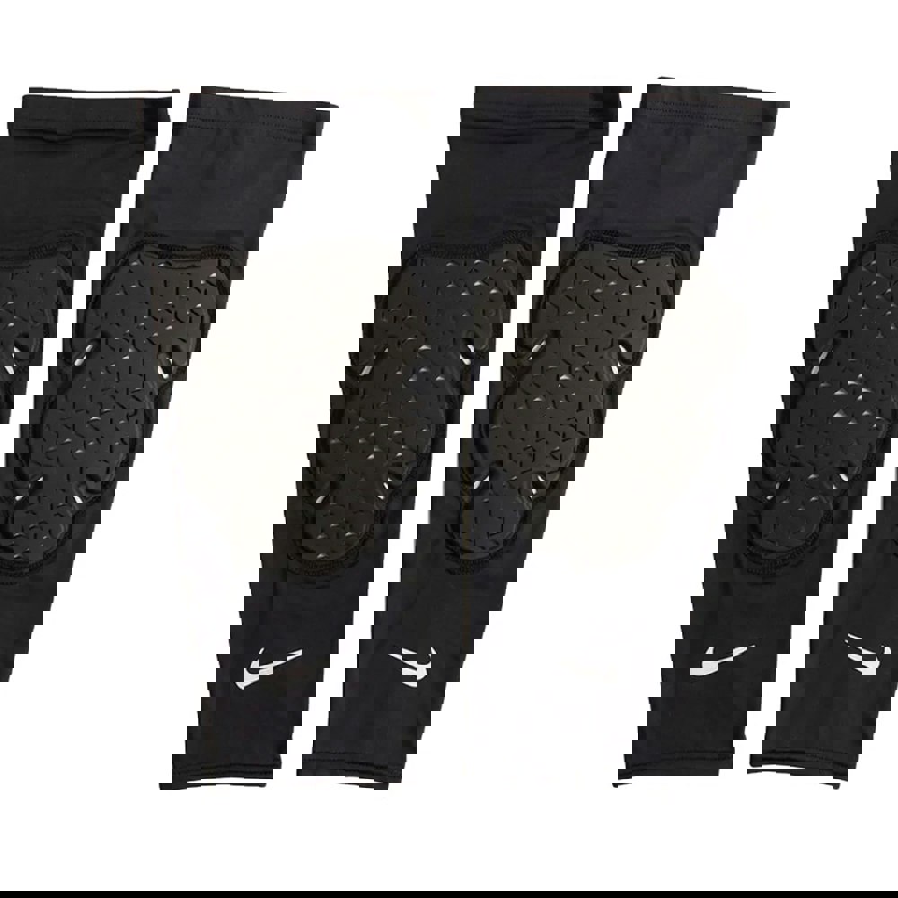 Nike Pro leg sleeves are made from foam and stretch fabric, finished in black with a logo detail. The construction includes breathable, flexible and soft properties, with cushioned compression for a close, supportive feel.