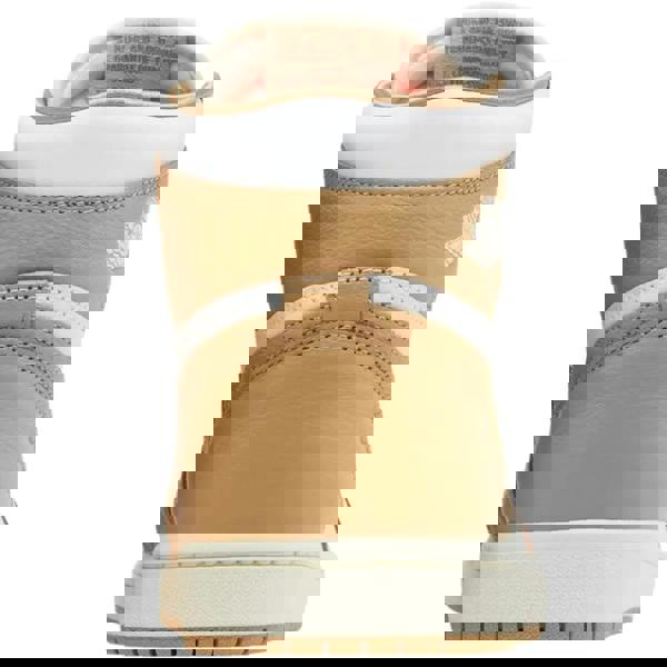These Nike women’s Air Jordan 1 Retro OG Praline trainers come in tan leather with a perforated upper and an ankle-high cut. A round toe and flat sole keep the profile clean, while the lace-up fastening is finished with ribbon detailing. The design includes a Swoosh and a 9-eyelet lacing system.