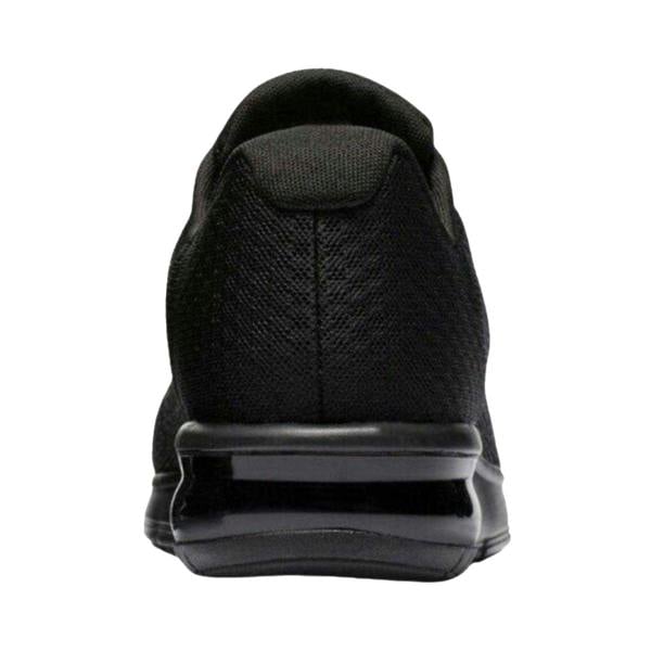 Nike Women’s Air Max Sequent 2 trainers in black with a low-cut profile and round toe. The upper combines mesh and textile, finished with a plain design and logo detailing. A lace-up fastening runs through six eyelets for a secure fit, while the flat sole construction keeps the silhouette clean and streamlined.