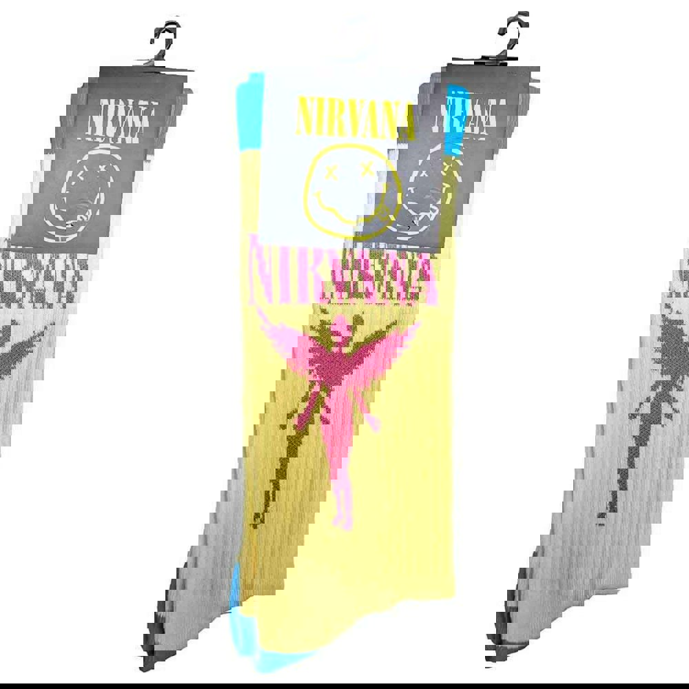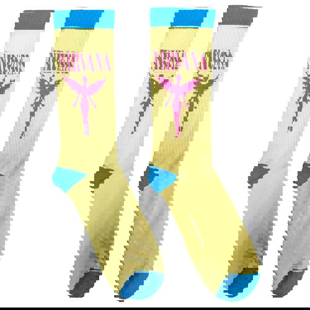 An official licensed Nirvana Terry Socks featuring the Angelic design motif. 75% Cotton, 20% Polyamide, 5% Elastane. Thicker terry cotton mix than standard ankle socks, providing greater cushioning and absorption - so perfect for sports!