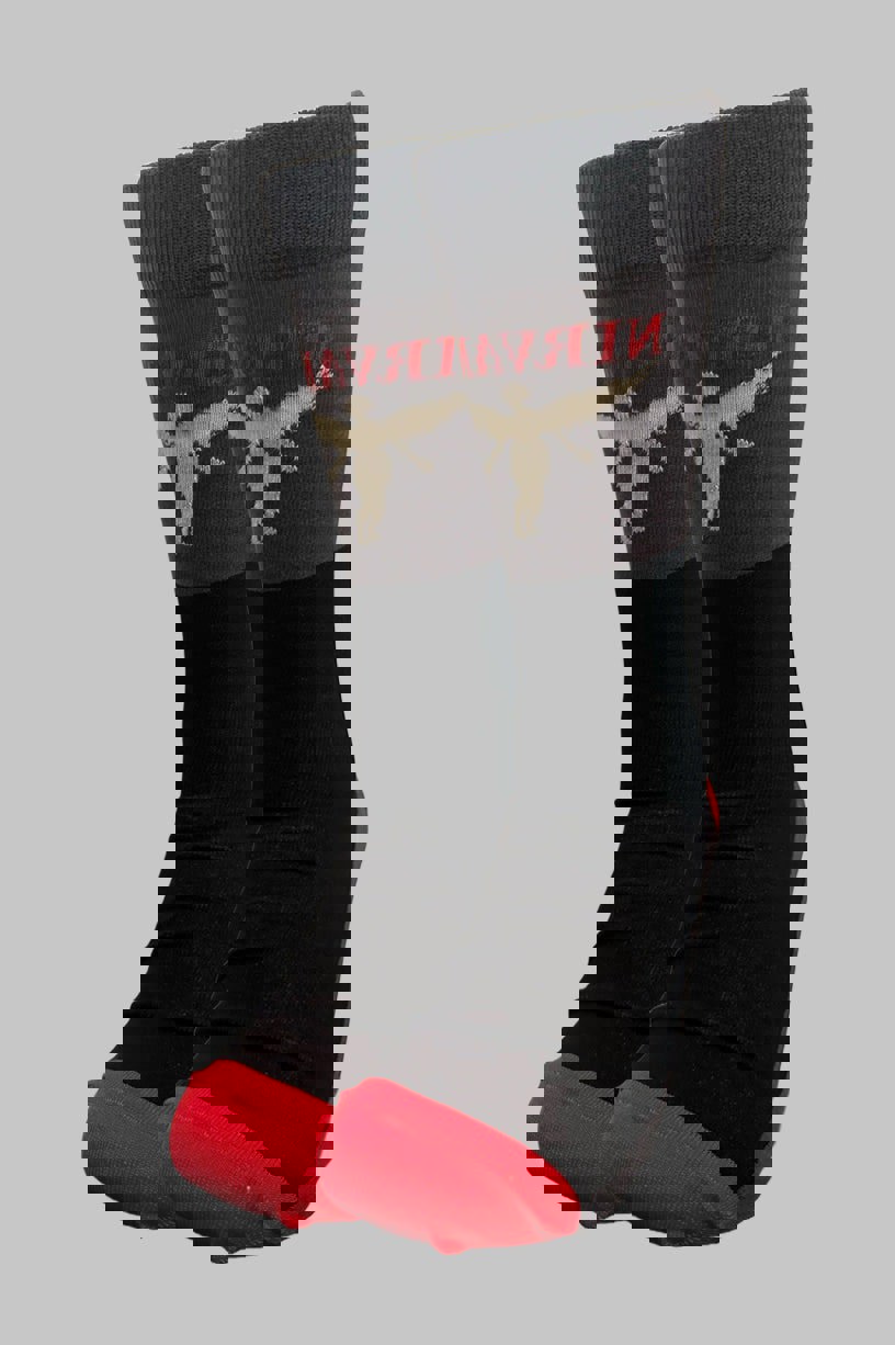 Official licensed Nirvana Unisex Ankle Socks featuring the 'In Utero' design motif. These high quality Ankle Socks are available in a charcoal grey colourway. These premium quality, colourful, all-over pattern cotton rich woven socks are guaranteed to stand out in the crowd.