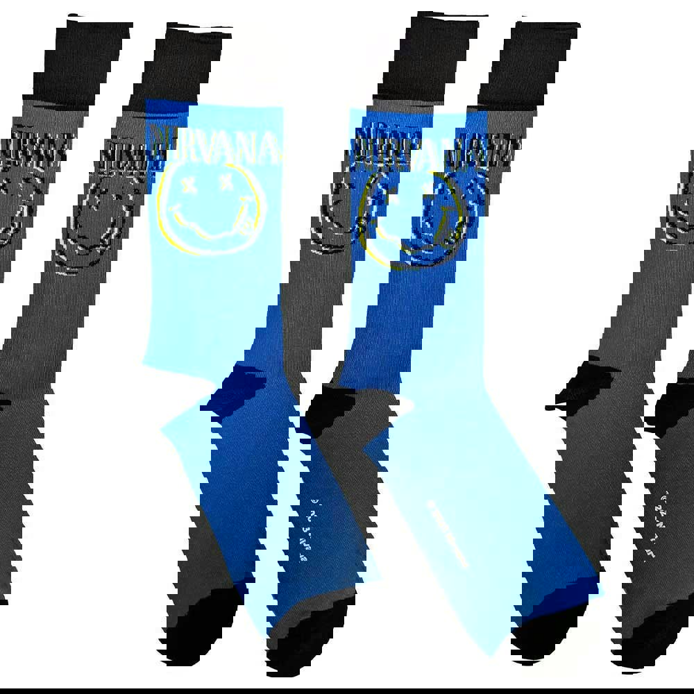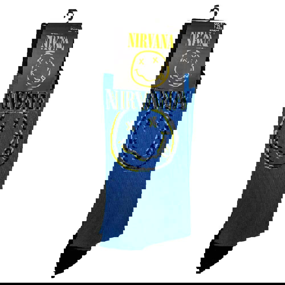 An official licensed Nirvana Unisex Ankle Socks featuring the 'Inverse Happy Face' design motif. This high quality Ankle Socks is available in a blue colourway. These premium quality, colourful, all-over pattern cotton rich woven socks are guaranteed to stand out in the crowd.