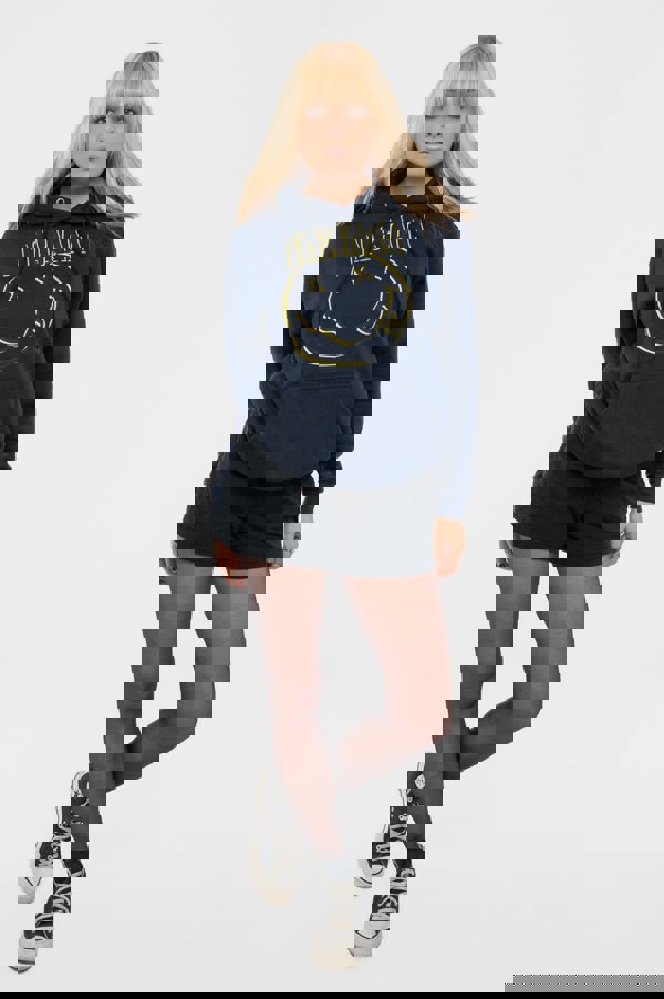 An official licensed Nirvana Unisex Pullover Hoodie featuring the 'Inverse Grunge Smile' design motif. This high quality Pullover Hoodie is available in a Navy blue colourway. Classic cotton pullover hoodie with hood, pouch pockets and front print design. Comes in a wide range of sizes from Small through XX-Large, subject to availability.