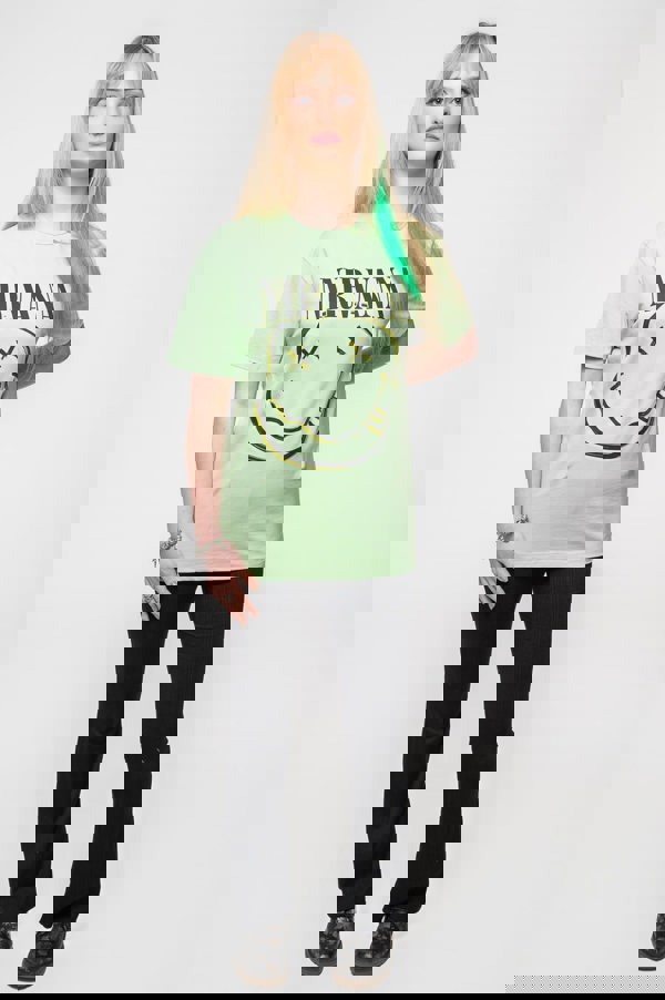 An official licensed Nirvana Unisex T-Shirt featuring the 'Inverse Grunge Smile' design motif. This high quality T-Shirt is available in a green colourway. Classic fit soft-style cotton tee with short sleeves and crew neck. Features front printing. Comes in a wide range of sizes from Small through XX-Large, subject to availability.