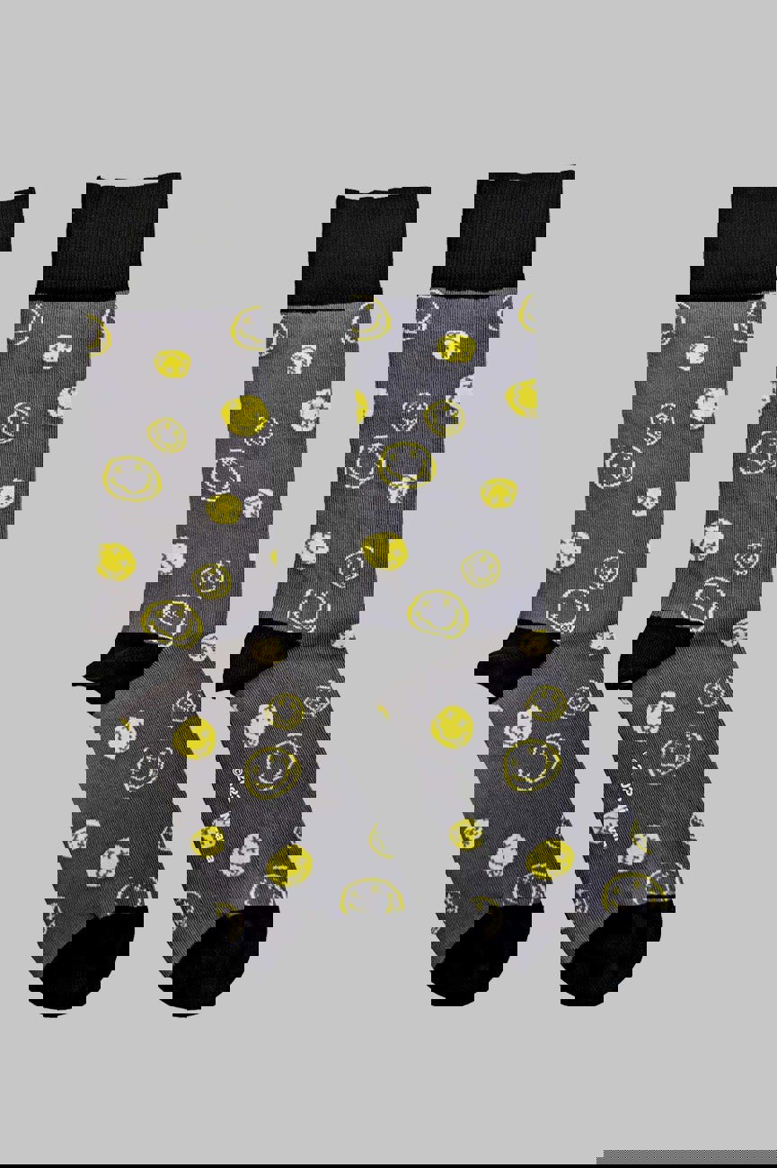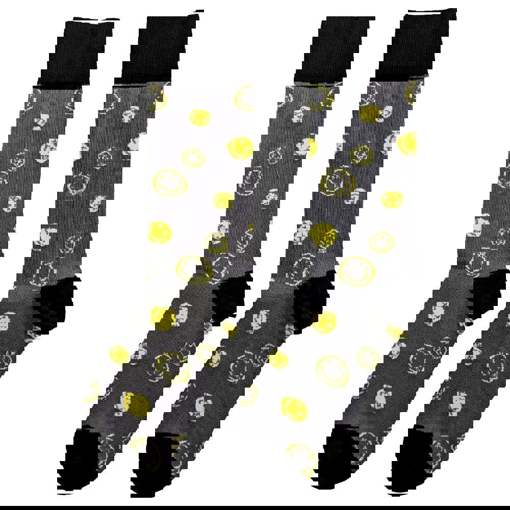 Official licensed Nirvana Unisex Ankle Socks featuring the 'Mixed Grunge Smile' design motif. These high quality Ankle Socks are available in a charcoal grey colourway. These premium quality, colourful, all-over pattern cotton rich woven socks are guaranteed to stand out in the crowd.