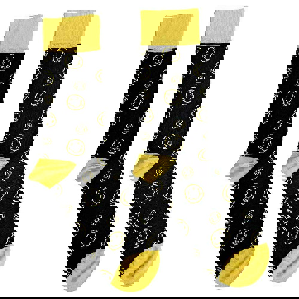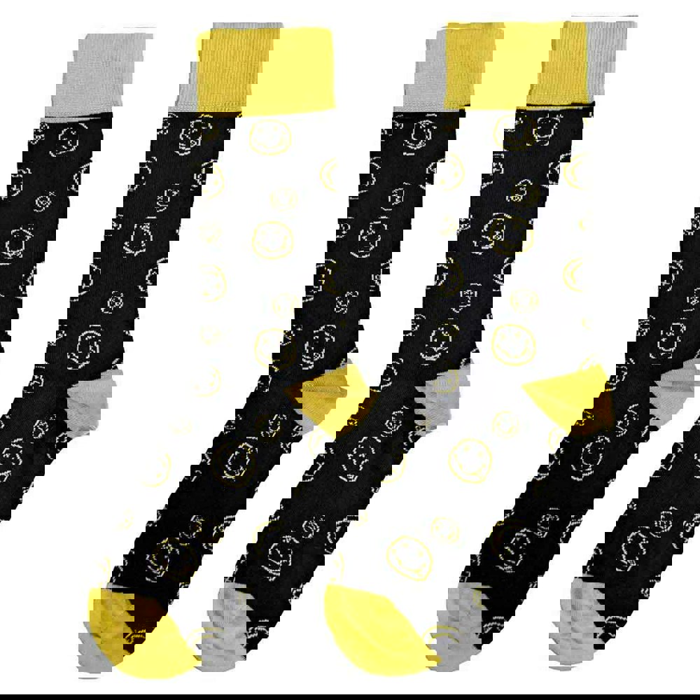 An official licensed Nirvana Ankle Socks featuring the Outline Happy Faces design motif. 85% Cotton, 12% Polyamide, 2% Elastane